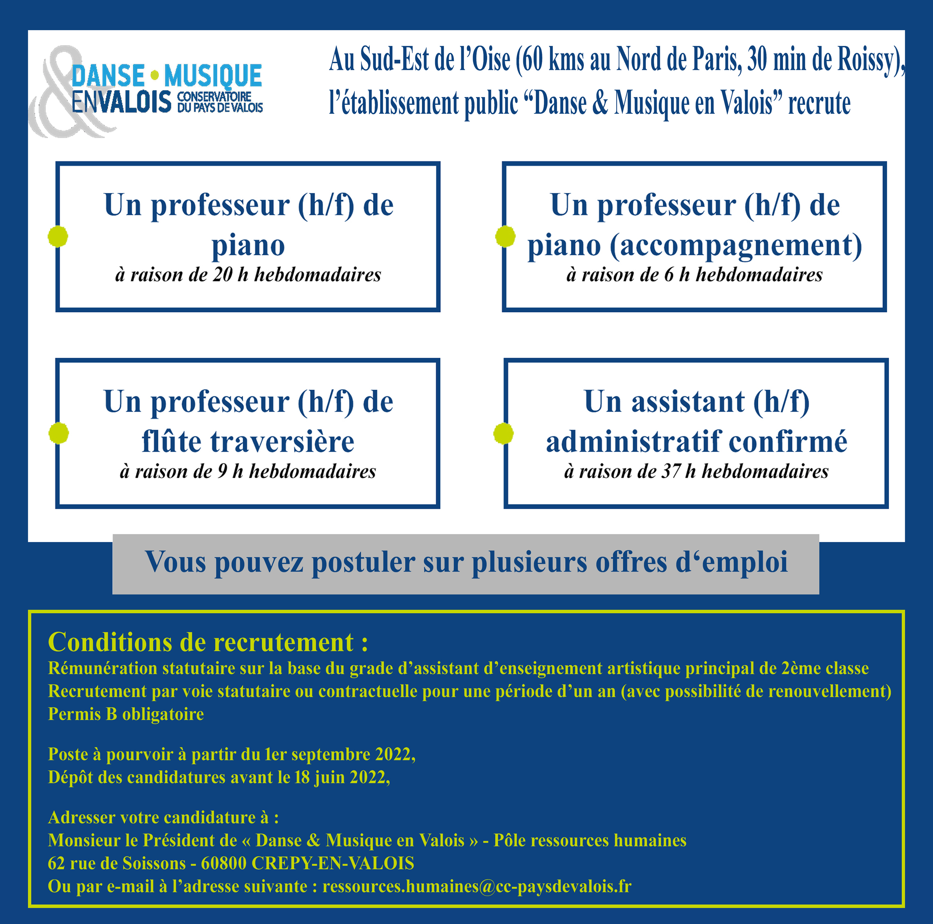 Au Sud-Est de l'Oise, l'établissement public "Danse & Musique en Valois" recrute :